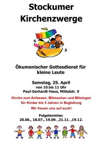 An folgenden Terminen findet im Paul-Gerhardt-Gemeindehaus für unsere Kleinsten ein fröhliches Singen, Spielen, Malen und Basteln rund um biblische Geschichten statt: